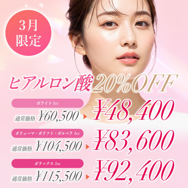 ヒアルロン酸はもともと人体の真皮層に存在する多糖類のことをいいます。人間の皮膚、眼球、関節に存在している保湿成分で、保水性に優れ、肌の張りや弾力を保っています。しかし、年齢と共に体内のヒアルロン酸の量は減少していくため、シワを悪化させる原因の一つにもなります。シワや窪みの部分に直接注入し、真皮の内側から肌を持ち上げることで、自然なボリュームを与え、お肌にふっくらとした感触を取り戻します。