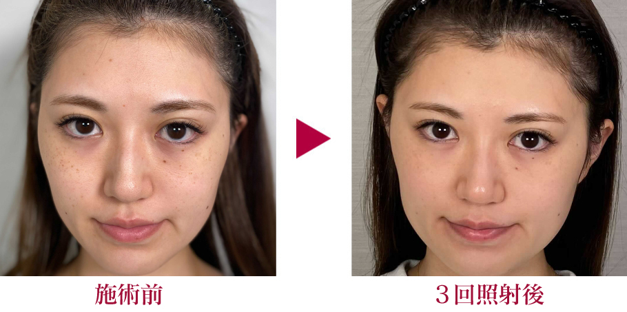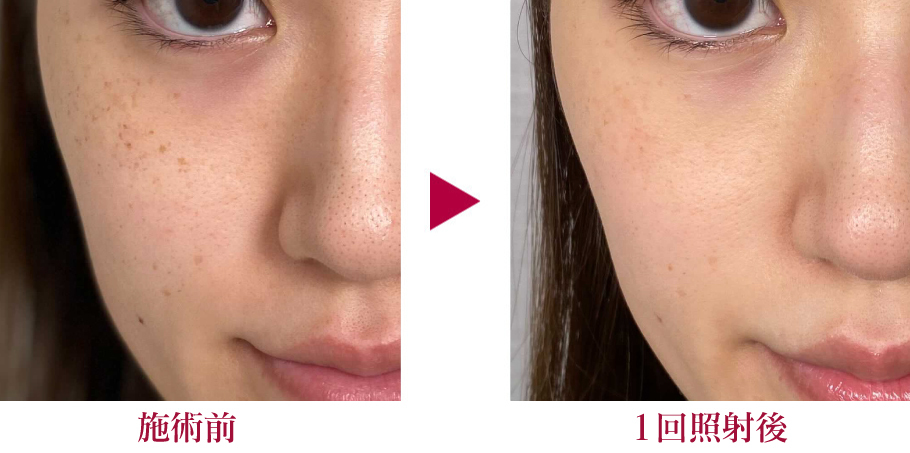 20代女性の症例です。1回の照射でしみ・そばかすが薄くなりました。3回照射後は、毛穴の開きやくすみが改善され、全体的にトーンアップいたしました。