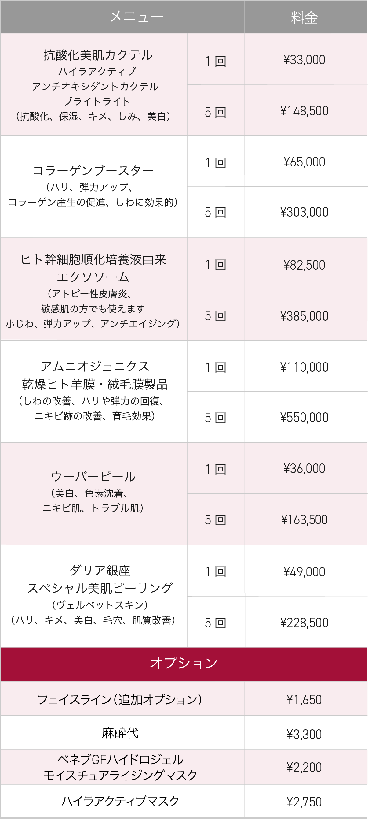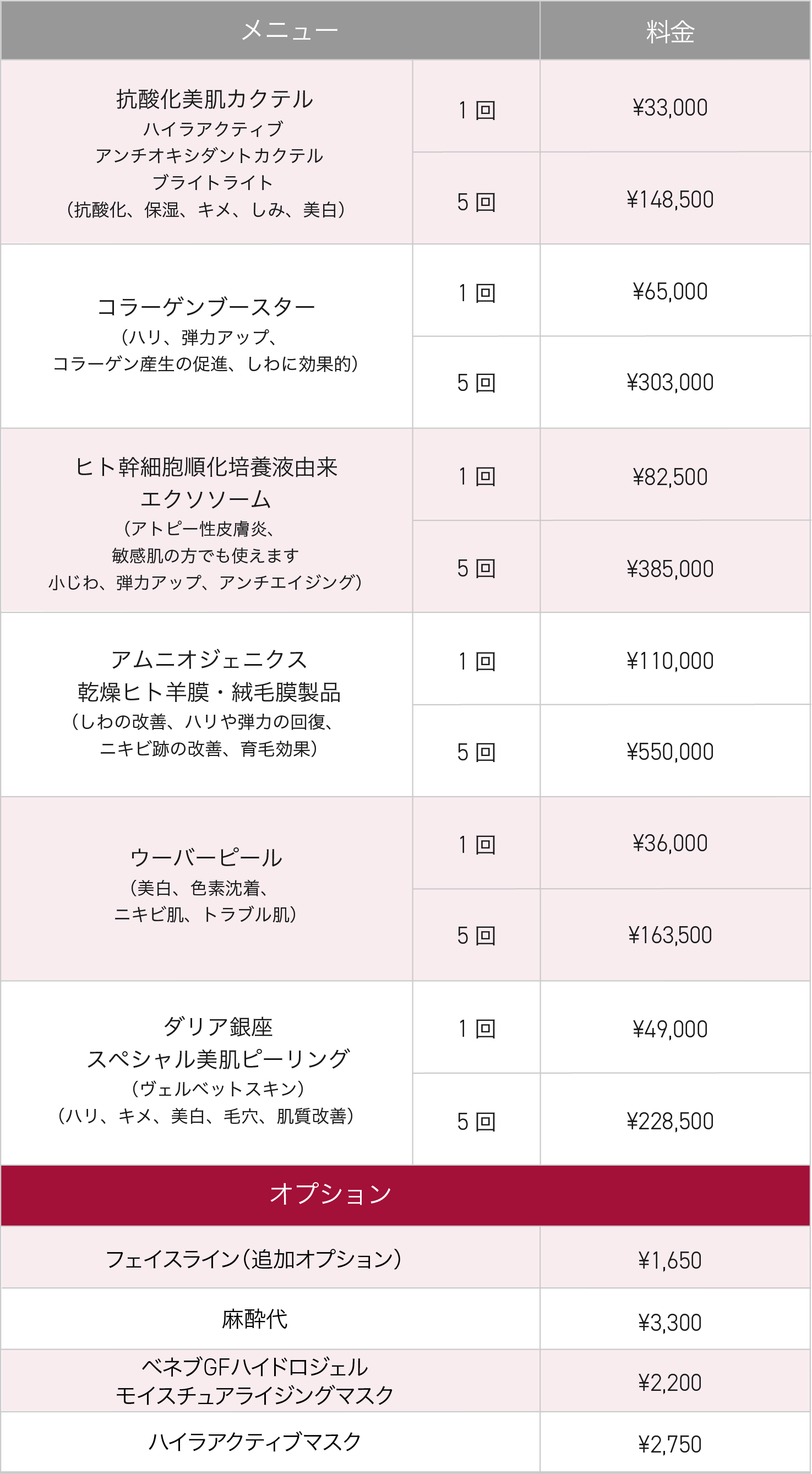 ダリア銀座スキンクリニックでは、患者様のお肌の状態やお悩みに合わせて、美肌効果の異なる薬剤メニューをご用意しております。