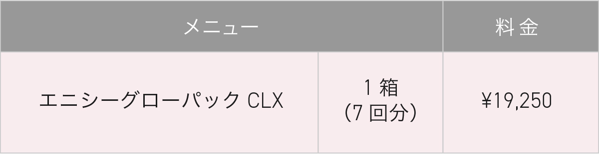 エニシーグローパックCLXは、従来の人気モデル「CL+」をベースに、肌再生に必要な美容成分を贅沢に配合した医療機関専売の炭酸ガスパックです。炭酸ガスによる肌の自浄作用サポートに加え、再生医療分野でも注目される成分を組み合わせることで、ハリ、ツヤ、透明感のすべてにアプローチ。ワンランク上の仕上がりを追求するプロ仕様のセルフケアアイテムです。