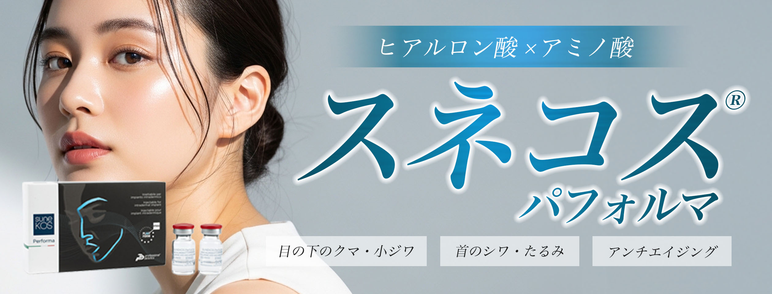 スネコス®パフォルマは、、非架橋結合のヒアルロン酸と6種のアミノ酸を特許比率で配合した製剤を真皮層に注入することで、コラーゲン・エラスチンの合成を同時に促し、肌の弾力やハリを回復させていく治療です。
