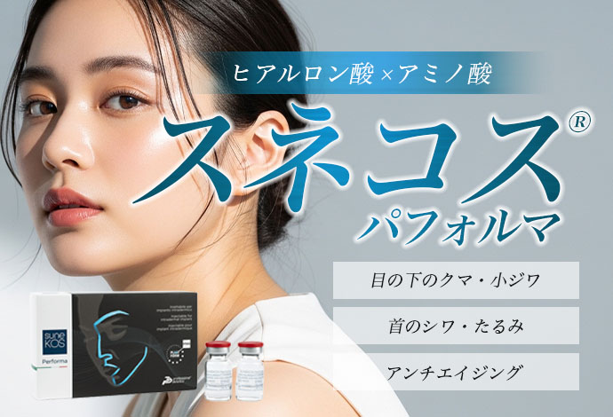 一般的なヒアルロン酸は真皮層にボリュームを出すために架橋(結合)されていますが、スネコス®パフォルマに配合されているヒアルロン酸は架橋されていないため粘度が薄くさらっとしている点が特徴です。スネコス®パフォルマには、真皮の構成要素であるコラーゲン・エラスチンなどを支える「細胞外マトリックス」を再構築して、肌の再生を促進する働きがあり、額、眉間、目尻などの小じわや目の下のクマなどを改善する働きが期待できます。ヒアルロン酸やボトックスよりも自然な仕上がりとなるため、ナチュラルな結果をお求めの方には特におすすめです。